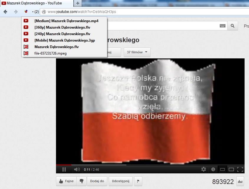 7. Teraz przetestujemy przykładowe ściąganie pliku mp4. Wejdź na Youtube i wpisz: „Mazurek Dąbrowskiego” i wybierz film. Następnie kliknij na dodatek Download Helper i wybierz plik [Medium] Mazurek Dąbrowskiego.mp4
