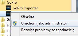 - Jeśli to nie pomoże uruchom GoPro Studio z poziomu Administratora. Naciśnij prawym przyciskiem myszy (PPM) na skrócie do GoPro Studio i dalej „Uruchom jako administrator”.