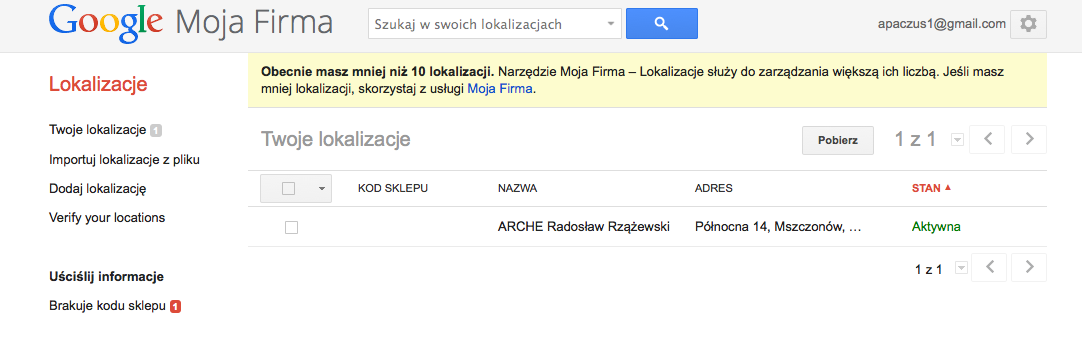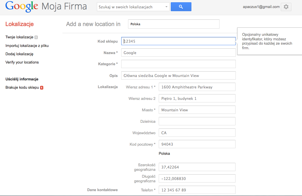 Aby dodać adres naszej firmy musimy mieć konto gmail oraz uruchomić stronę pod adresem: