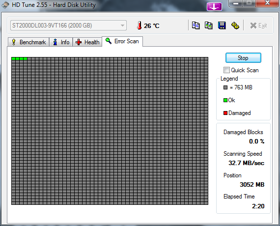 W połowie bo teraz należy zarezerwować (w zależności od pojemności dysku twardego i szybkości komputera) od kilkunastu minut do kilku godzin. Trzeba wejść w ostatnią zakładkę „Error scan” i kliknąć „Start” oraz zmówić dziesiątkę różańca, aby nie pojawił się żaden czerwony kwadracik 🙂