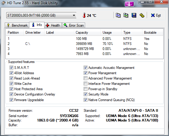 Po ściągnięciu i zainstalowaniu programu (instalacja jest banalnie prosta polegająca na klikaniu „Dalej”) należy najlepiej zrestartować komputer. Po ponownym uruchomieniu systemu operacyjnego należy uruchomić program. Składa się on z 4 zakładek. Pierwsza z nich Benchmark to narzędzie służące do pomiaru wydajności Twojego dysku twardego. Tą zakładką nie będziemy się zajmować. Następna zakładka to Info – są to informacje o możliwościach Twojego dysku twardego (Supported features).