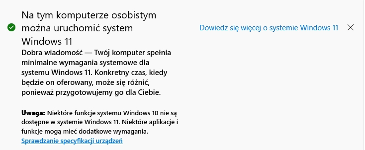 bądź też zupełnie inny – taki, że „Ten komputer nie spełnia obecnie wszystkich wymagań systemowych dotyczących systemu Windows 11”.